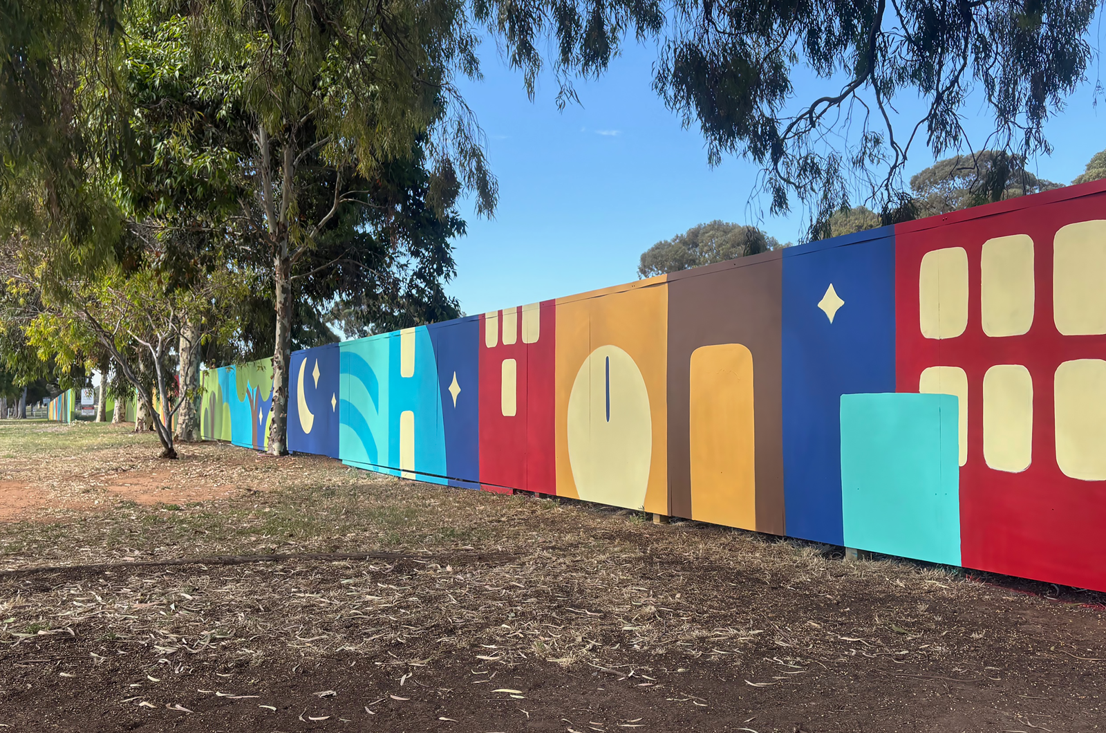 To beautify the 150m long construction hoarding alongside bustling Port Road, Thebarton, I created this mural featuring dynamic shapes inspired by Adelaide’s diverse landscapes, from the coast and dunes, through leafy suburbs and along the Torrens River/Karrawirra Parri, to the peaceful parklands and heart of the city. The design captures the rhythm and movement of the landscape, celebrating connection, place and journey. Thank you to artist Sam Brooks for assisting in the installation of this project.